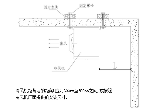 冷风机和背墙之间的距离为300~500mm,或按冷风机厂家提供的尺寸;